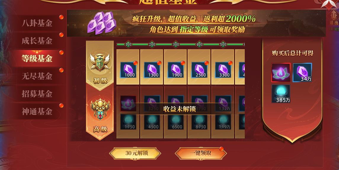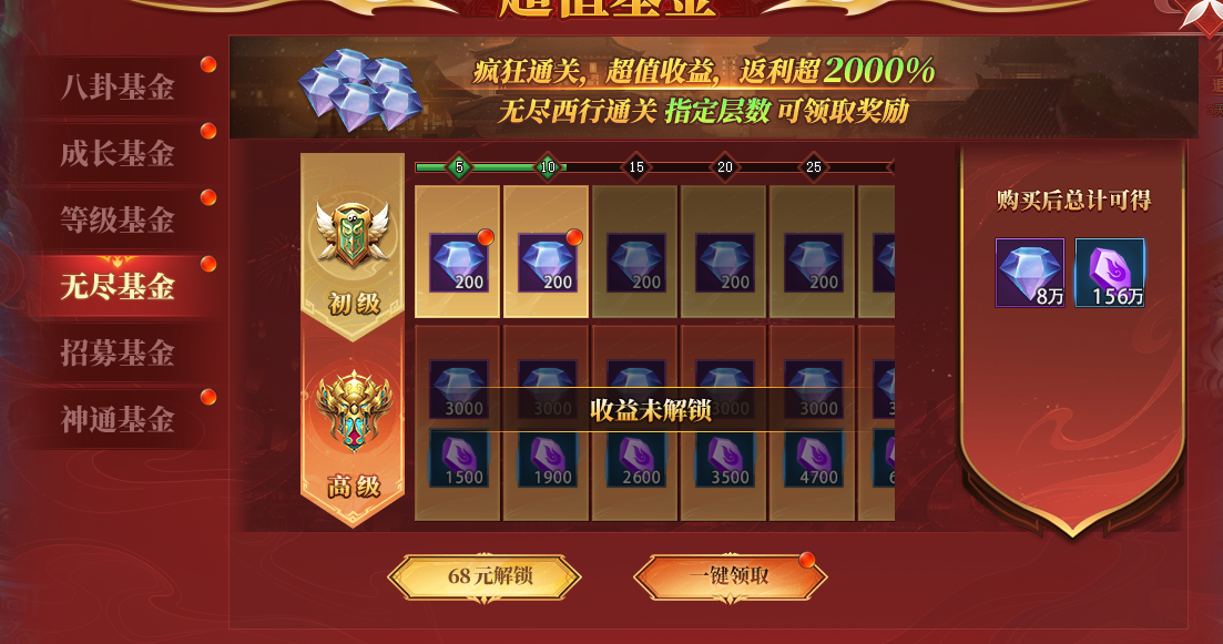 能获得升阶石的活动比较少,开服第二天开启的等级基金和无尽基金可以获得大量升阶石,性价比非常高,不可错过